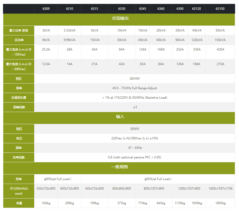 6300系列三相交流電源最高輸出可達300kVA, PWM脈寬調變設計實(shí)現省電與節約空間等效益。高電源功率滿(mǎn)足工業(yè)馬達,空調系統及充電站等運轉測試。6300寬廣的頻率輸出范圍也使它能符合航空、軍事的法規與測試需求。