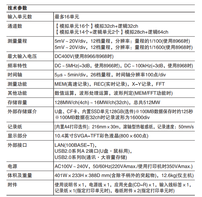 使用說(shuō)明書(shū)×1, 應用光盤(pán)(波形查看Wv/通訊指令表) ×1, 電源線(xiàn)×1, 輸入線(xiàn)標簽×1, USB連接線(xiàn)×1, 記錄紙×1 (帶打印單元時(shí)),卷紙附件×2 (帶打印單元時(shí))