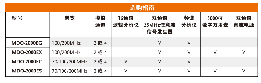 MDO-2000EG具有內置頻譜分析儀和雙通道25MHz任意波發(fā)生器;MDO-2000EX具有內置頻譜分析儀、雙通道25MHz任意波發(fā)生器、5000位數字萬(wàn)用表和雙通道5V/1A電源;MDO-2000EC具有內置邏輯分析儀、頻譜分析儀和雙通道25MHz任意波發(fā)生器;MDO-2000ES 具有內置邏輯分析儀、頻譜分析儀、雙通道25MHz任意波發(fā)生器、5000位數字萬(wàn)用表和雙通道5V/1A電源“六合一”機種全功能示波器