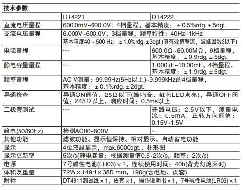 測試線(xiàn)DT4911×1,保護殼×1,使用說(shuō)明書(shū),7號堿性電池(LR03)×1