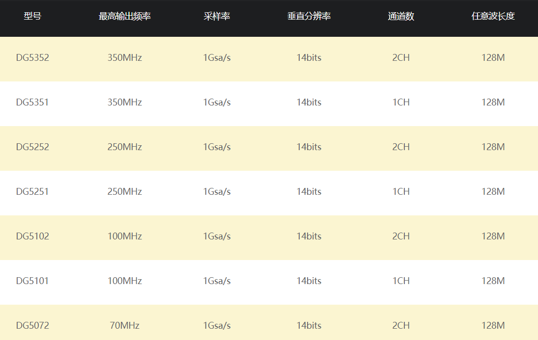 350MHz、250MHz、100MHz或70 MH四種正弦最大輸出頻率,1GSa/s采樣率,14 bits 分辨率