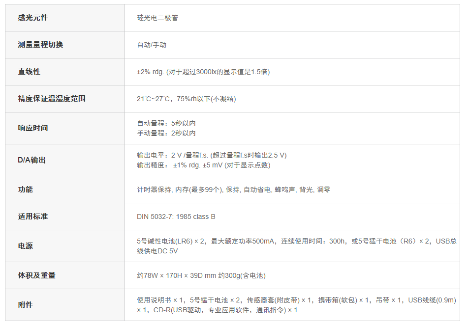 JIS C 1609-1:符合2006一般型Class AA 覆蓋范圍廣,從LED照明和低照度(應急燈等)到高照度的測量