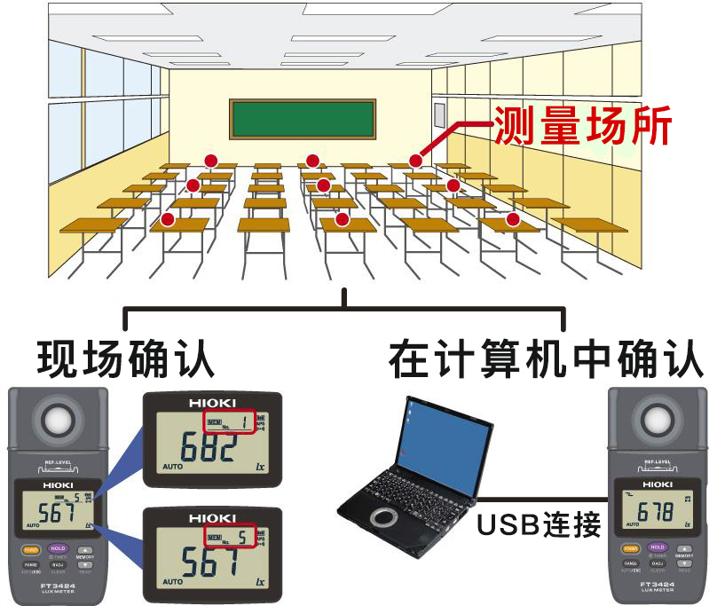 能將多個(gè)測量場(chǎng)所的測量值保存在內存中(最多99組數據)。 節省了手工記錄所測的照度的工夫。 主機讀取所存數據,或使用USB通訊讀取至計算機中。 (可保存為T(mén)XT格式)
