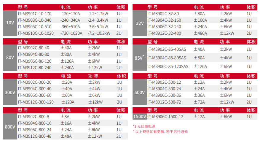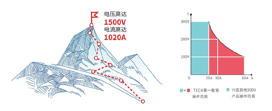 IT-M3900C全系列共有28個(gè)型號,輸出電壓從10V~1500V,單機輸出電流最大可達1020A。采用寬范圍的輸出設計,相較于傳統固定范圍輸出直流電源,為用戶(hù)提供了更多的電壓和電流組合,讓使用更加靈活。單臺電源就可以涵蓋用戶(hù)廣闊范圍的應用需求,大幅降低電源系統搭建的復雜度及占用空間。