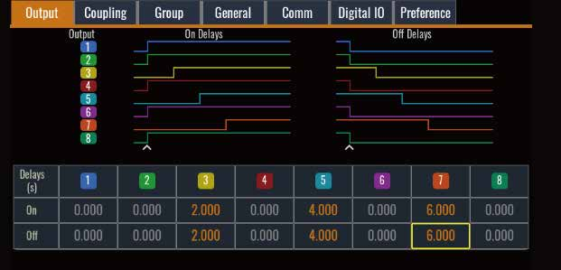 每個(gè)輸出的開(kāi)啟/關(guān)閉延遲功能使您可以對輸出的開(kāi)啟/關(guān)閉進(jìn)行序列化設置。